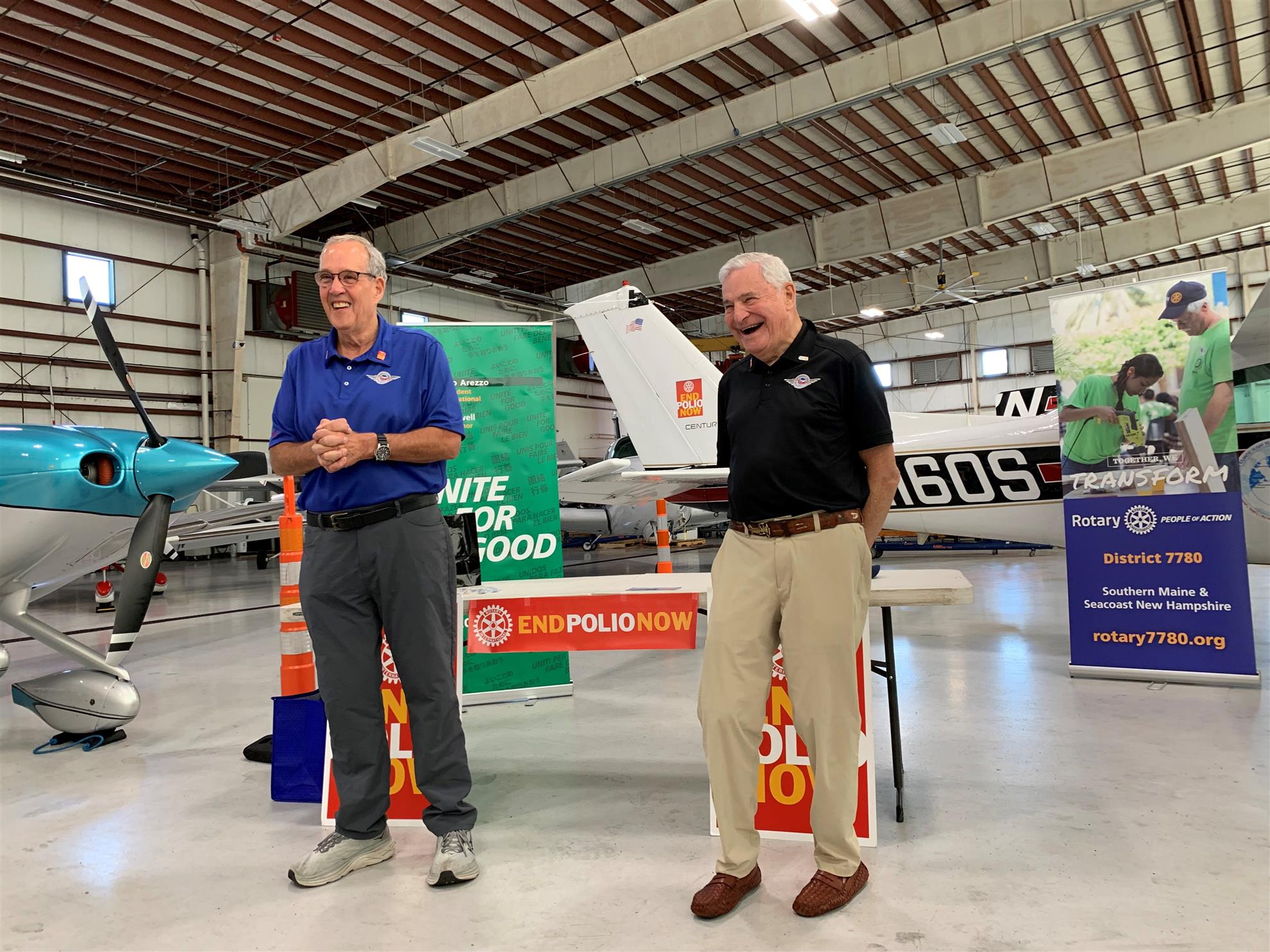 That has been the message that Iowa Rotarian Peter Teahen, along with New Jersey Rotarian Ed Galkin have been spreading as they flew around the Atlantic Ocean. District 7780 was their last stop before heading home, and they spoke to District 7780 Rotarians whose schedules were able to accommodate the last-minute date change. Past Foundation trustee Brenda Cressey welcomed the pilots and reminded us that when we hear about “cases” that each case is a child who has been afflicted with polio.