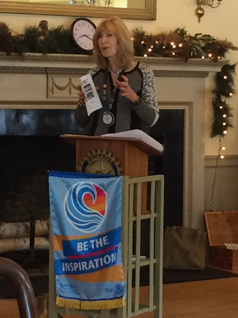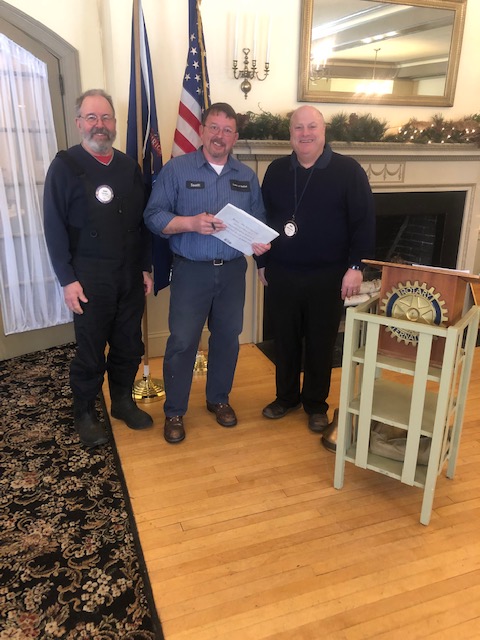 Above left: Robin Zinchuk, a volunteer for Bethel Area Arts & Music (www.ba-am.org), updates club members on the highlights of this new local arts & cultural organization. Above right: Rotarian Scott Hynek and President Mike Steven flank Scott Sumner, the Town of Bethel Road Foreman, after he did an informative Q & A on the many functions of the town road crew.