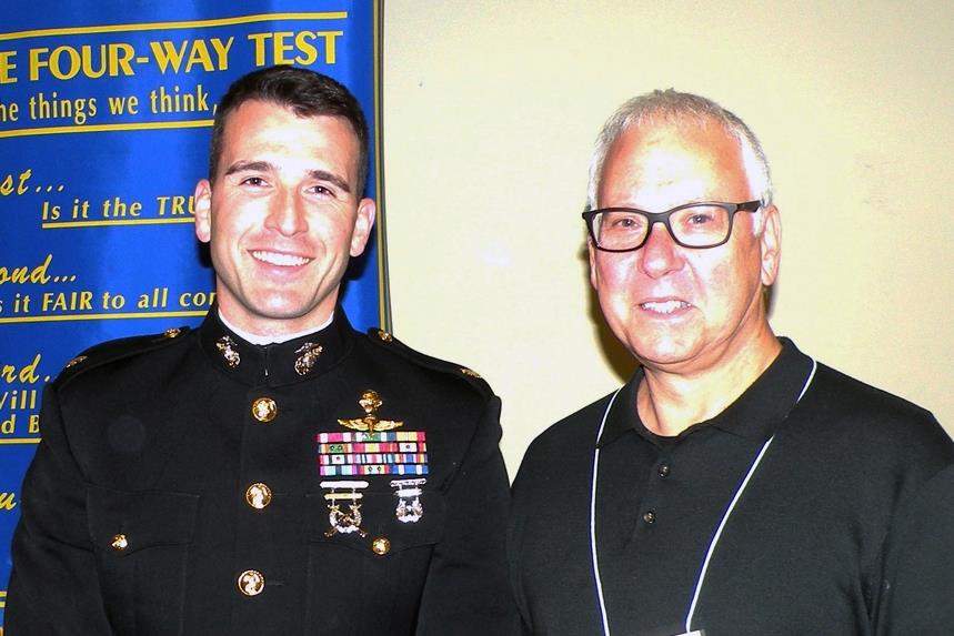An honor guard Flag Ceremony was led by the 1st Battalion 25th Marines with a Presentation of Colors, followed by the Pledge of Allegiance, led by Rotarian, and Marine Veteran Bob Traill followed by the singing of the National Anthem the "Star Spangled Banner", led by Kathy Grammer. Major Tom Wallin USMC was the officer in charge of the Honor Guard. A solo guitar tribute to veterans was performed by Denny Breau <https://www.youtube.com/watch?v=Kx5EAPSz7Gs> , who is a US Army veteran.
